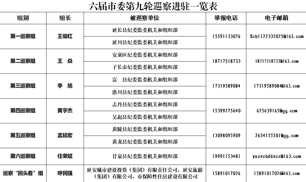 按照市委统一部署,六届市委第九轮巡察共派出7个巡察组,从2025年11月13日开始至12月31日结束,第一至第六巡察组对县(市、区)纪委监委机关和组织部开展提级巡察,同步开展意识形态和保密工作责任制专项检查,巡察“回头看”组对延安城市建设投资(集团)有限责任公司、延安旅游(集团)有限公司、市保障性住房建设有限公司等3个单位开展巡察“回头看”。